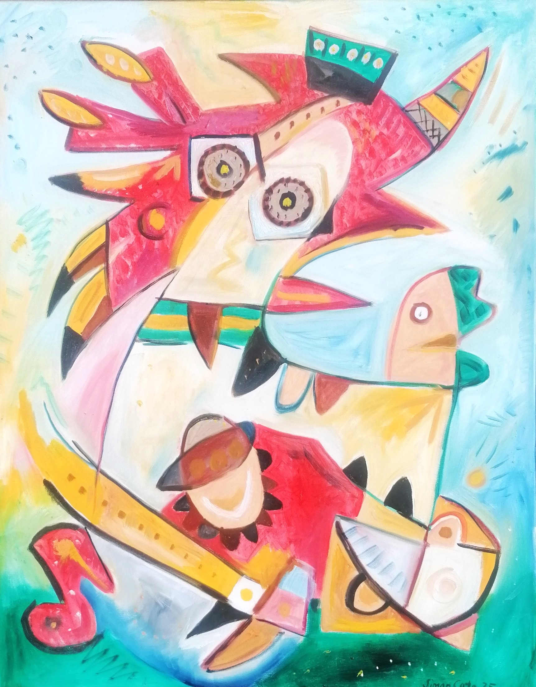 “Simon Spang-Hanssens (DK, 1955) malerier inviterer beskueren på en magisk og eventyrlig rejse, hvor det foranderlige, fantasifulde og fascinerende flyder sammen. Kunstværkerne bevæger, aktiverer og engagerer beskueren. Med farverige udtryk og legende former bliver værkerne levende med poetiske og humoristiske udtryk. De enkle men dog udtryksfulde virkemidler vidner om, at Simon Spang-Hanssens opfindsomhed og kreativitet ikke kun er forbeholdt hans musikalske karriere. Farver og former er i værkerne sat sammen i æstetiske relationer, og de flygtige gestikulationer af organiske og lyriske penselstrøg fører tankerne hen på jazzmusikkens vuggende rytmer og improvisatoriske frihed. Simon Spang-Hassen er inspirereret af bl.a. Kandinsky, Picasso og Miro, men det er tydeligt, han i værkerne har fundet sin egen ”klangfarve”, sin stil, som tjener til hans individuelle, kunstneriske udtryk”.